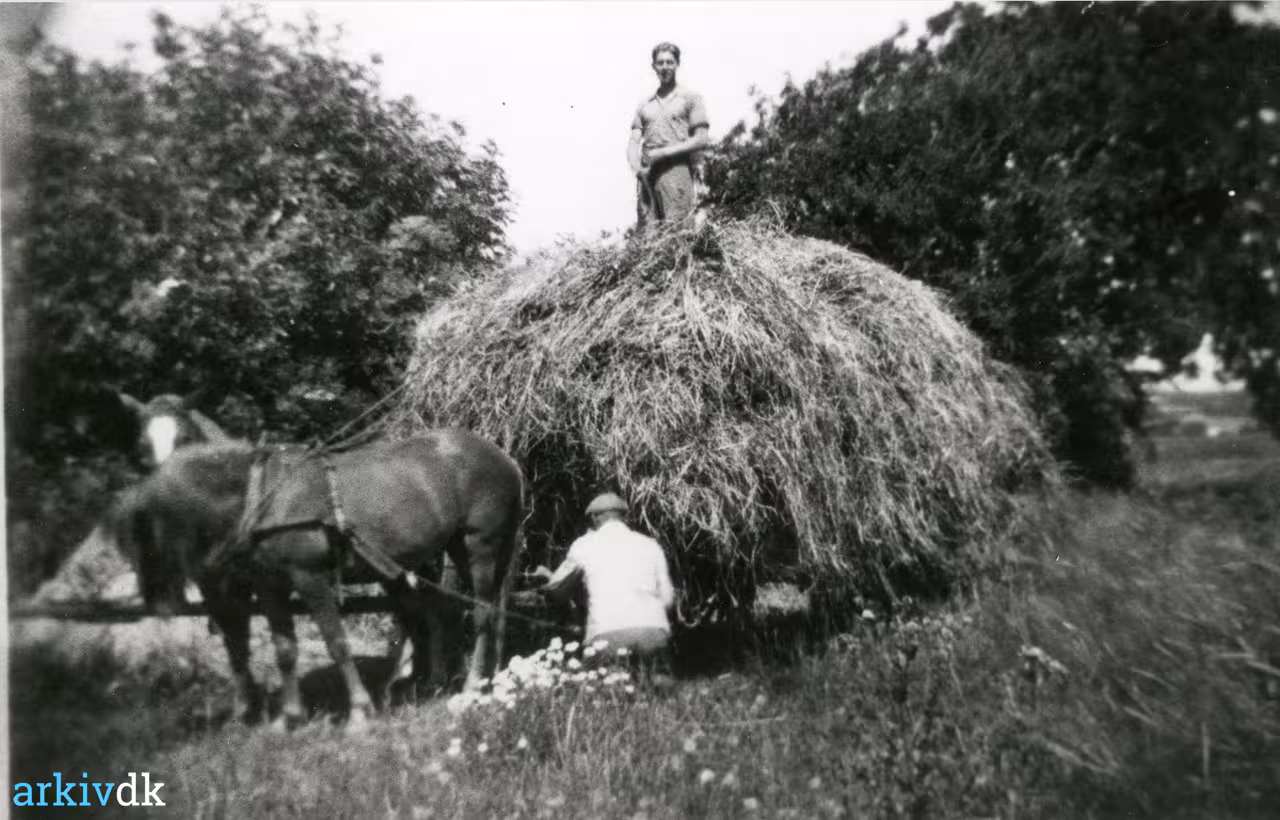 | Beskrivelse | Personerne på fotoet er Chr. Hummel og sønnen Jens, der her ses i færd med at bringe et læs hø hjem til laden. |