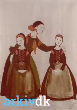Ballet. Livjægerne på Amager. Kunstneren Bjørn Wiinblad's udkast til dragter til Bournonvilles ballet Livjægerne på Amager. Dette udkast hedder: Amagerkone med to piger