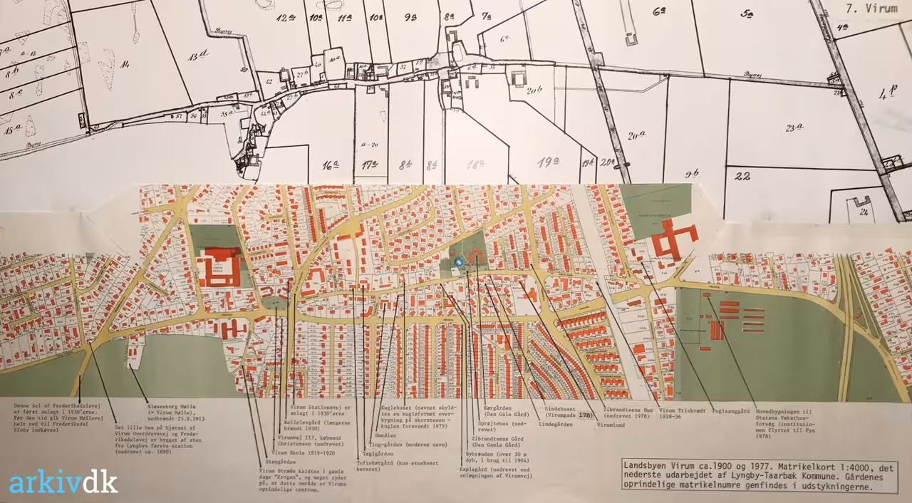 Landsbyen Virum ca. 1900 og 1977. Matrikelkort 1:4000, det nederste er udarbejdet af Lyngby-Taarbæk Kommune. Gårdenes oprindelige matrikelnumre genfindes i udstykningerne. Nederst på siden er der informationer om steder, som forbindes til kortet med påtegnede streger. |