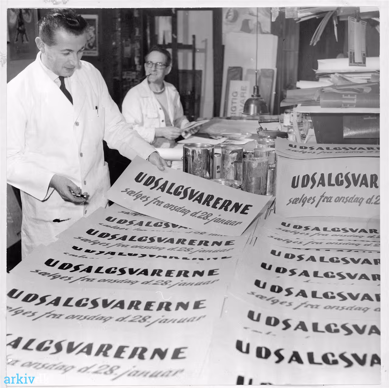Beskrivelse Forberedelser til februarudsalget. Malermester Klindt vurderer antallet af skilte til årets store vinterudsalg. 1/1959