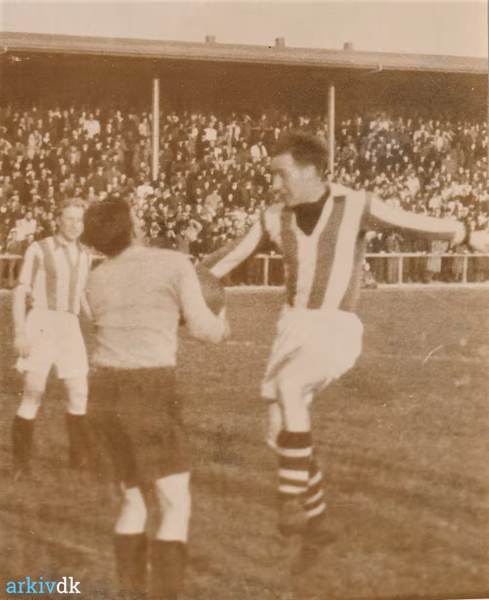 Fra venstre ses AaB'erne James Sørensen og målmand Ejnar Jensen (Bim). Spilleren fra Aalborg Chang (med stribede strømper) er Rudolf Søgaard. Ejnar Jensen er født den 20. februar 1921. Rudolf Søgaard er født den 14. august 1916. Død den 20. november 1997. |
