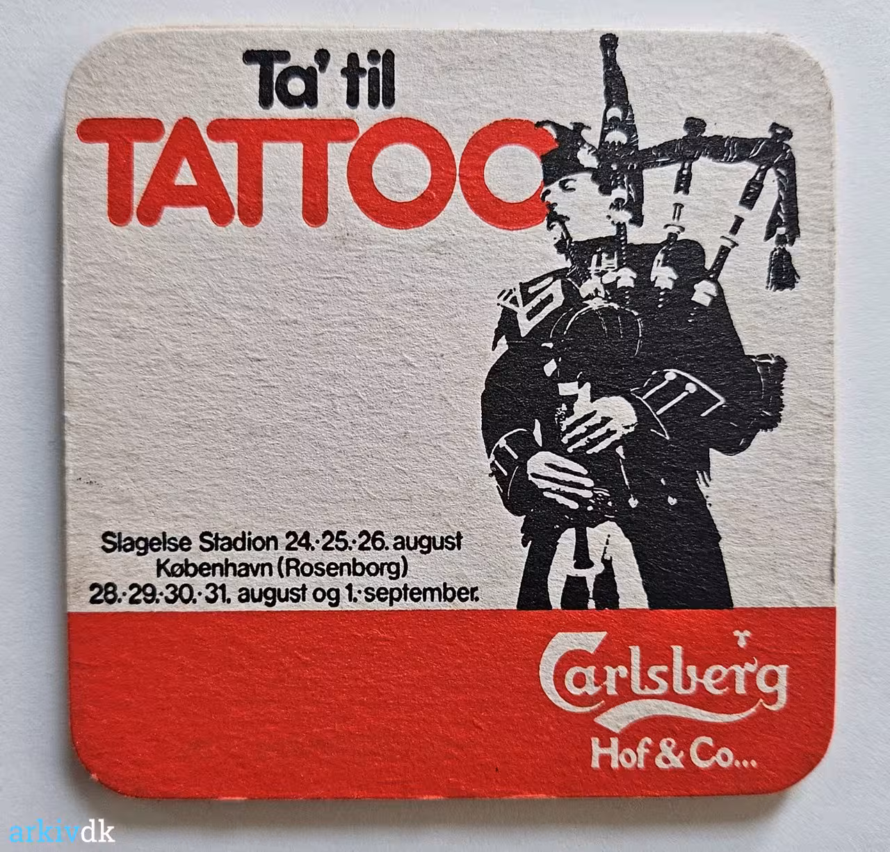 Med stencil af sækkepibespiller. Opmærket: ”Ta' til Tattoo Slagelse Stadion 24. . 25. . 26. august København (Rosenborg) 28. . 29. . 30. . 31. august og 1. september" _ _ _ Kritisk omtale i Land og Folk 17-08-1984 s. 5 Omtale i avisen Djursland, herunder om DRs udsendelse, 21-09-1984 s. 32 |