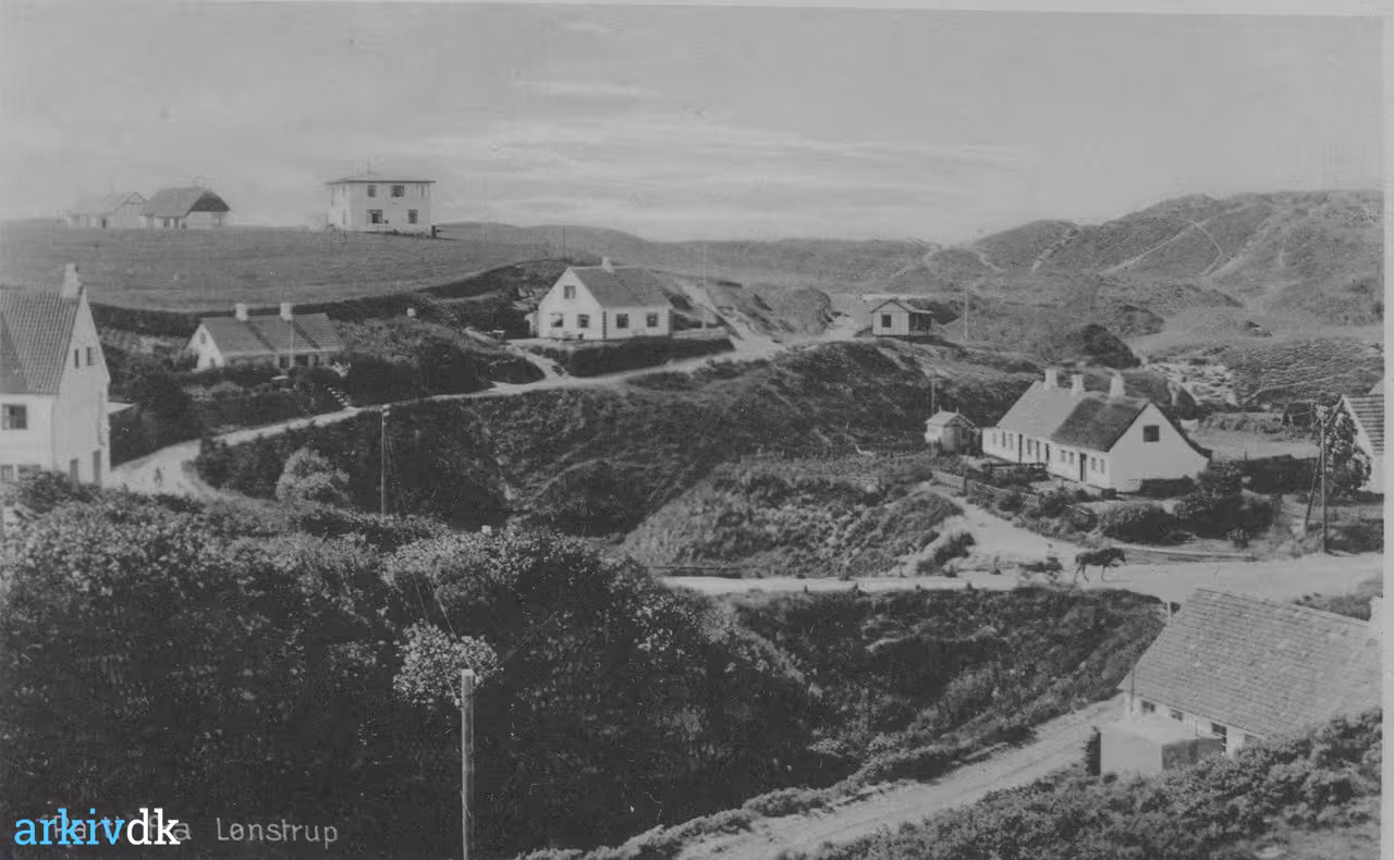 Beskrivelse Billedet er taget fra klitterne neden for Rødovrehus, og man kan se Bækhuset, Wrensteds Hotel, Skipperhuset og Vesterklit 11 11.