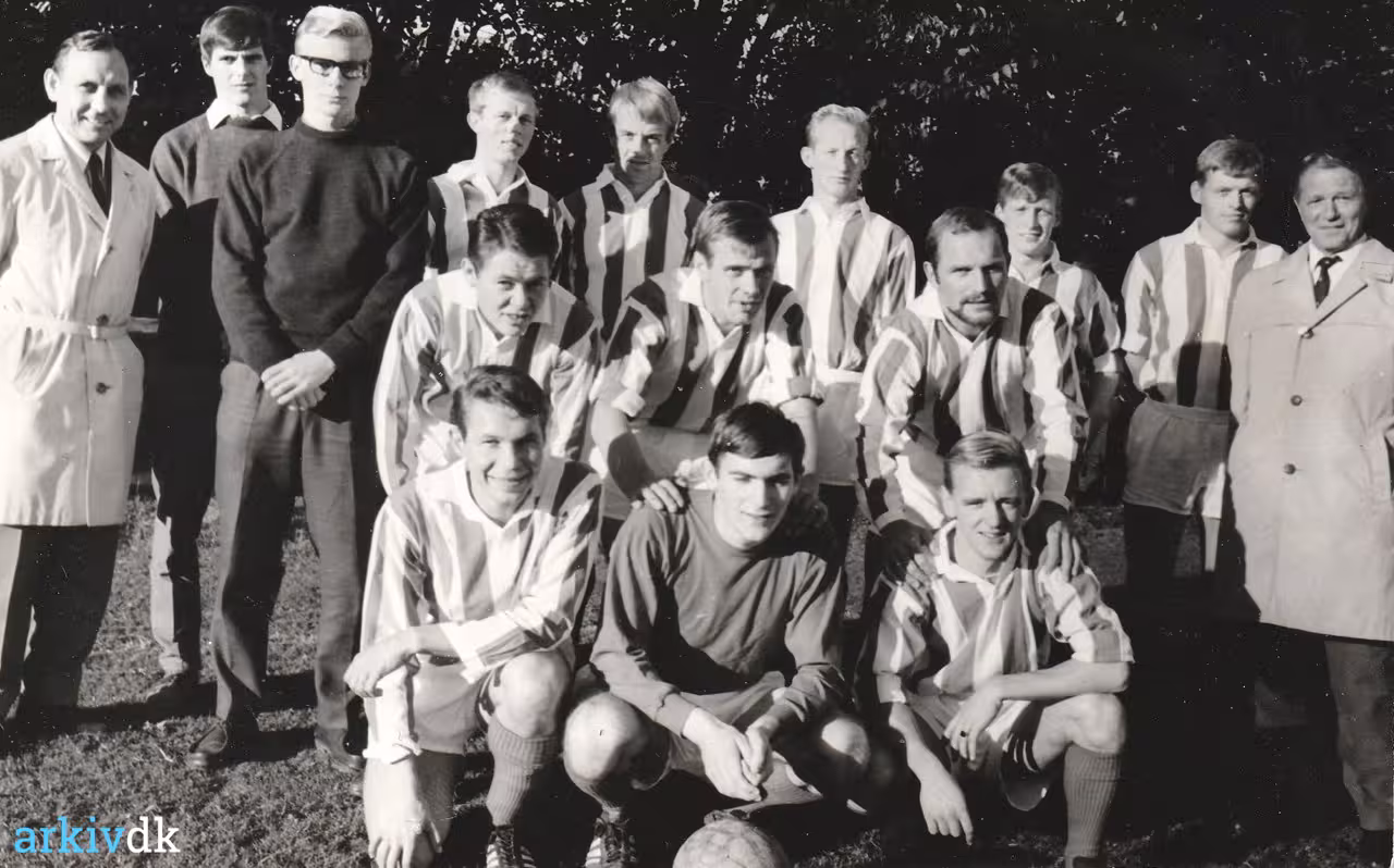 I midten ses fra venstre: Børge Bach, Preben Larsen og Heini Hald. Forrest fra venstre ses: Søren Rasmussen, Karsten Simensen og Finn Jensen. Peter Hugo Hansen er født den 11. august 1946. Søren Rasmussen er født den 25. september 1947. Rudolf "Rudi" Strittich er født den 3. marts 1922. Død den 11. juli 2010. Børge Bach er født den 20. januar 1945. Død den 7. juni 2016. Ole Christoffersen er født den 8. oktober 1948. Jens Engelbrechtsen er født den 2. november 1910. Død den 30. marts 1988. Jens Flou er født den 24. september 1942. Heini Hald er født den 4. januar 1942. Claus Johansen er født den 13. marts 1948. Preben Holm Larsen. Født 30. september 1941. Alfred Nielsen er født den 30. oktober 1945.. Død den 7. juli 2019. Finn Jensen er født den 12. november 1944. John Andersen er født den 7. december 1948. Død den 11. oktober 2011. Karsten Simensen er født den 27. september 1948. Leif Elsberg er født den 17. januar 1946. |