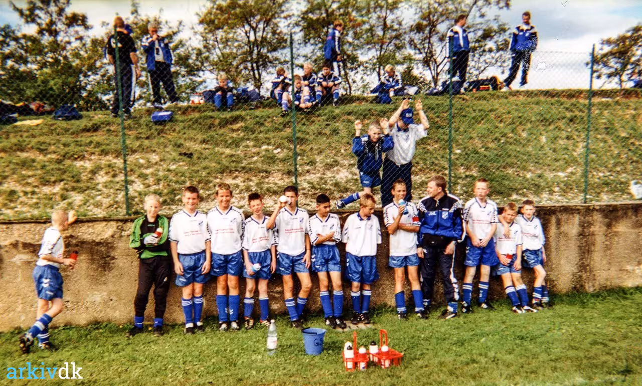 Forrest fra venstre Dennis Petersen, Claus Pedersen, Jan Sanden, Nikolaj Byrdal Nielsen, Martin Dahl Berthelsen, Adi Salahovic, Amed Maroufi, Christian Færløv Nielsen, Lasse Olesen, træner Johnny Nymark Pedersen, Tommy Friis Sørensen, Kristian "Kesse" Hansen og Kasper "Super" Sørensen. Drengen der hænger i hegnet er Jakob Højlund og hans far. Drengen øverst til venstre er Hans Henrik Aaen. I den lille flok i midten er det fra højre Seid Višo og Jonas Lassen Jensen. Yderst til højre står Anders Hollen. Stefan Lantau Fjeldgaard Olsen går for oven i midten. Drengene er i Gandrup Sportsklubs spillertøj - hvide bluser, blå shorts og blå strømper. Målmanden i grøn trøje og sorte bukser, og træneren i blå træningsdragt. |