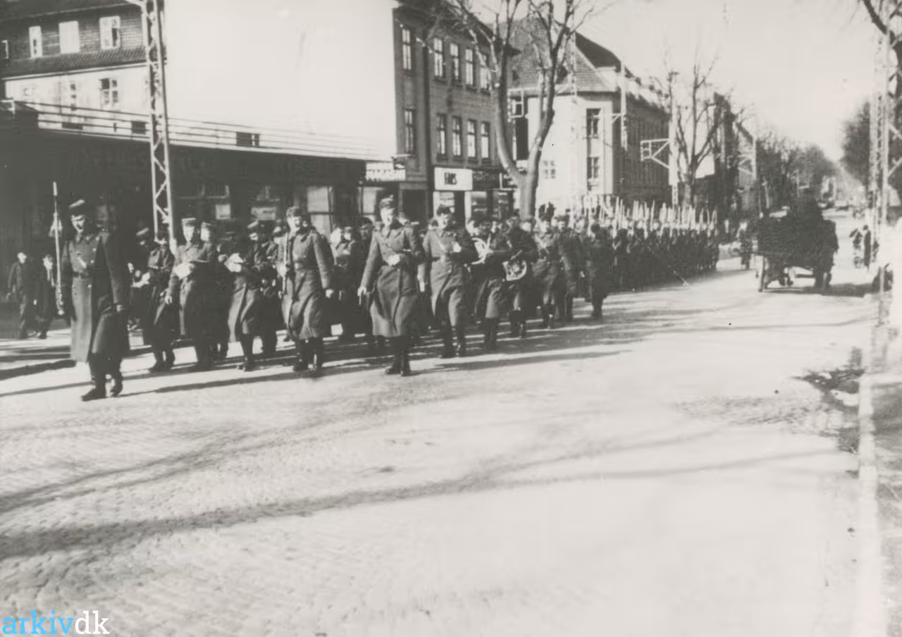 Garden i geled på vej op ad Lyngby Hovedgade ud for Engelsk Herre Magasin. Forrest musikkorpset og bagved garden med gevær.