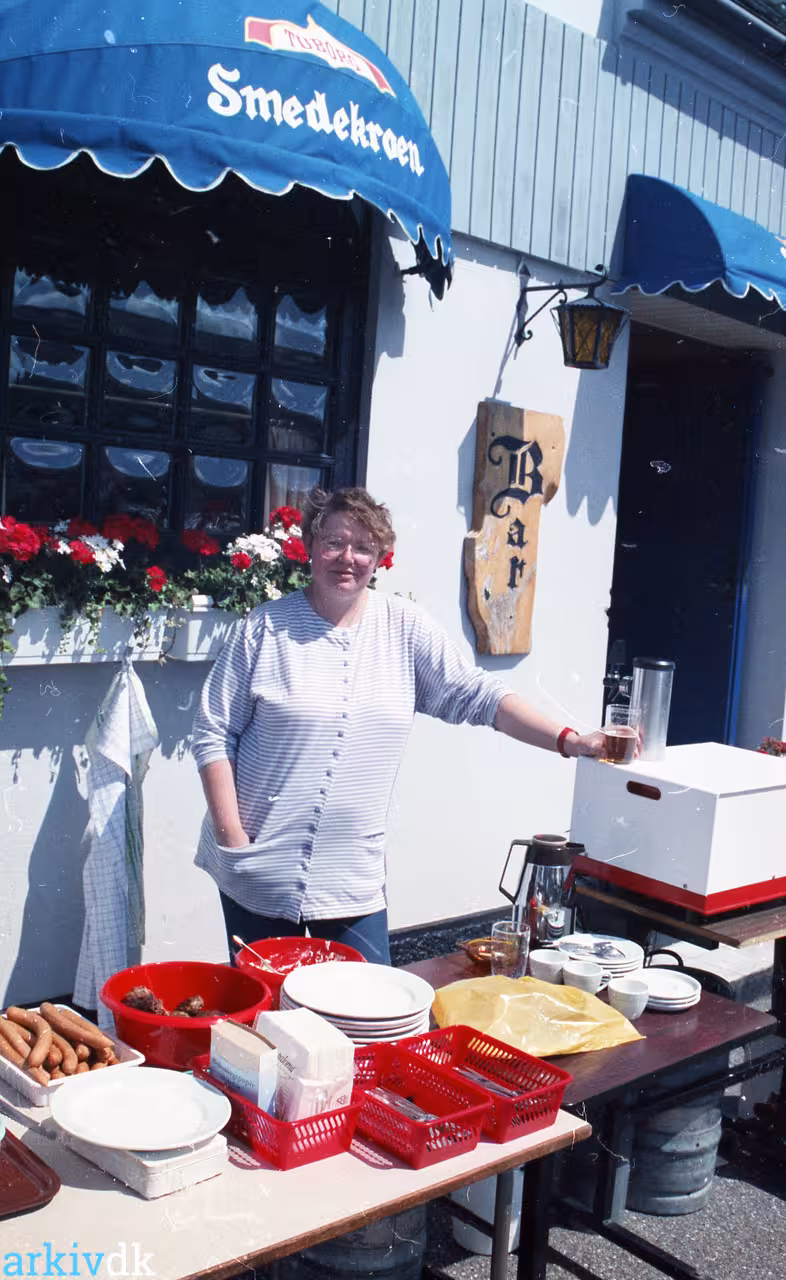 Beskrivelse Judith Lyngså ved buffet-bord uden for Smedekroen i Hals.