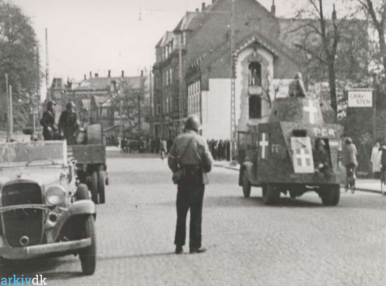 Beskrivelse Den hjemmelavede "panservogn" kort efter befrielsen ud for Lyngby Gadekær.
