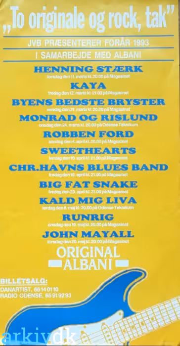 Henning Stærk Kaya Byens Bedste Bryster Monrad og Rislund Robben Ford Sweethearts Christianshavns Blues Band Big Fat Snake Kald mig Liva Runrig John Mayall |