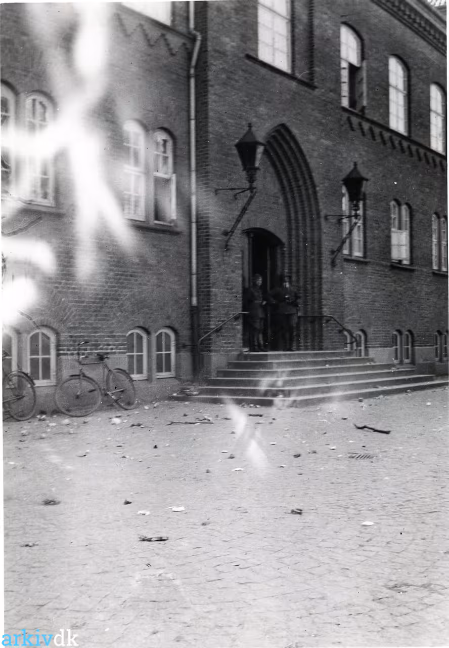 1 Tilskuere foran Nakskov Politistation den 3. maj 1931, dagen efter opstanden. Soldater fra Vordingborg patruljerer foran tilskuerne med påsatte bajonetter.