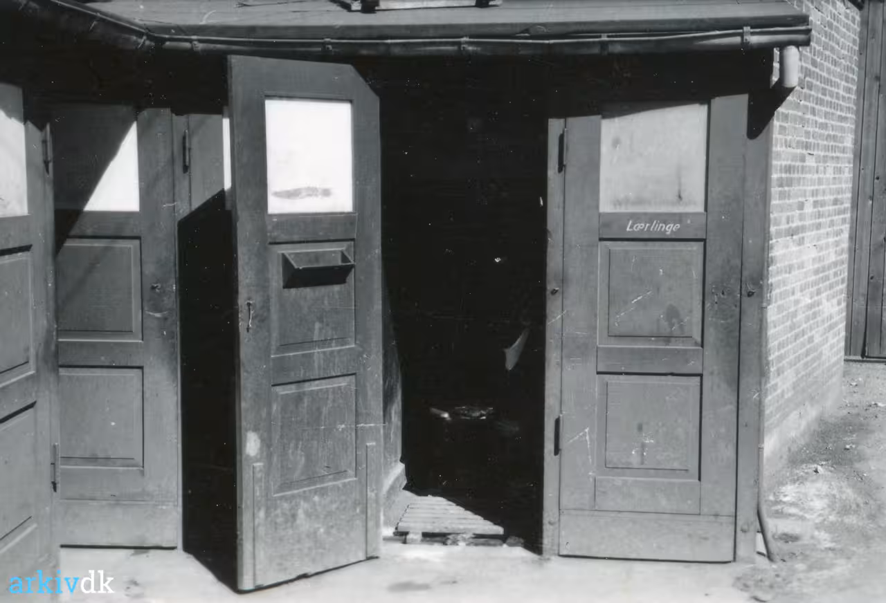 6 2 billeder, Bukh A/S fabriksbygninger på Østre Havnevej, Kalundborg. Udhusbygninger og det gamle lokum, "das" Med specielle "aflukker" for lærlinge.