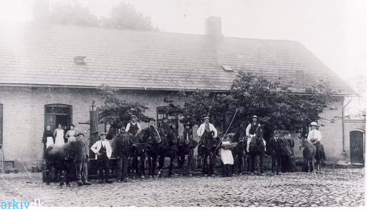 Ejere til højre på fotoet og folkehold samt heste til venstre for ejerne. Nøragersminde - gården opkaldt efter Nørager. I 1918 blev Nøragersminde overtaget af to sønner af A. Hansen fra Amager Frø på Amager Landevej. Vestamager på Tømmerups fælledjord. |