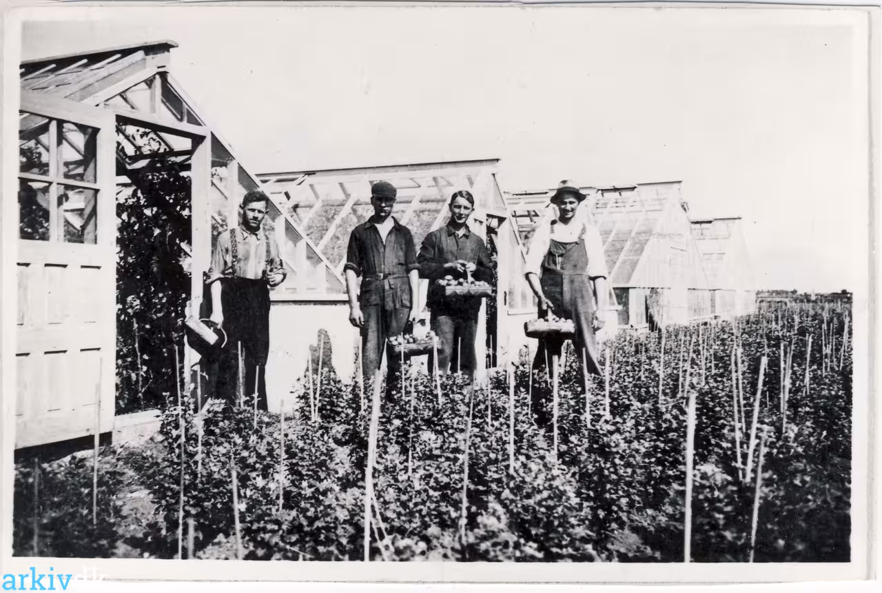 Tomatplanter i drivhusene. Fra venstre: Den svenskfødte Carl Engstrøm, Johan Zimling, Jacob Bernitt, Peter Hansen |