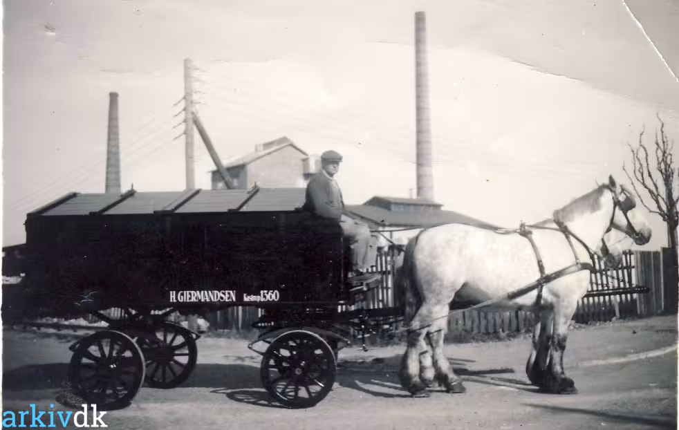 Beskrivelse Hans Gjermandsen med skraldevogn og hestene Knold og Tot ved Amager Strandvej. I baggrunden Kastrup Værk og