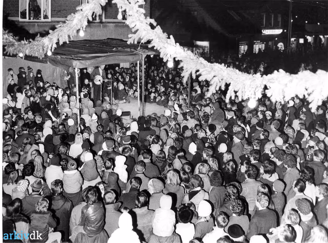 Freddy Fræk underholder den sidste søndag før jul ud for Jernbanegade 39 (Andelsbanken). 1971, Haslev