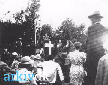 Beskrivelse Urban Hansen på talerstolen ved fest på Ugerløse Idrætsplads 11.07.1943.