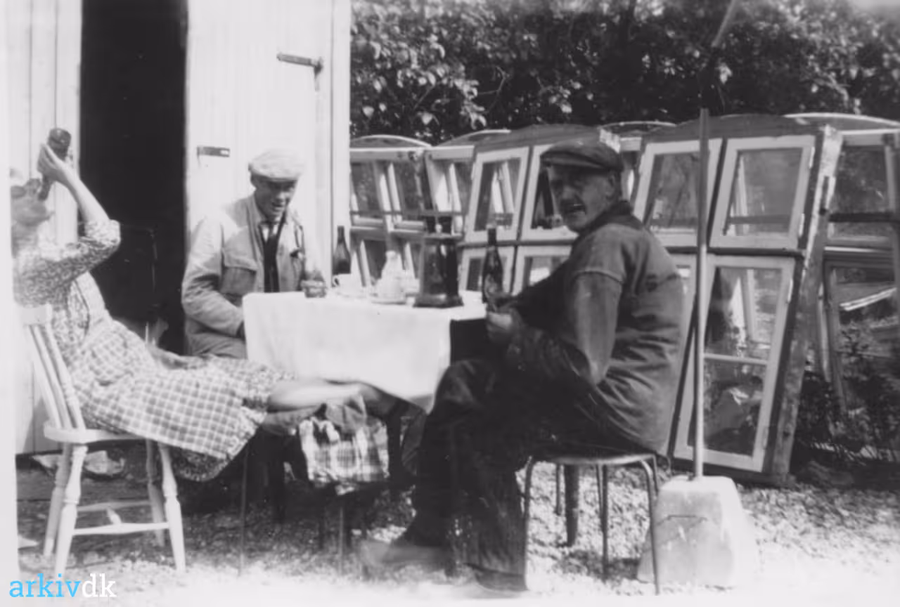 | Beskrivelse | Irma Tipsmark nyder en øl i selskab med Alfred Hansen, Dræbyvej og "gamle" Hans fra Kølstrupvej 40.